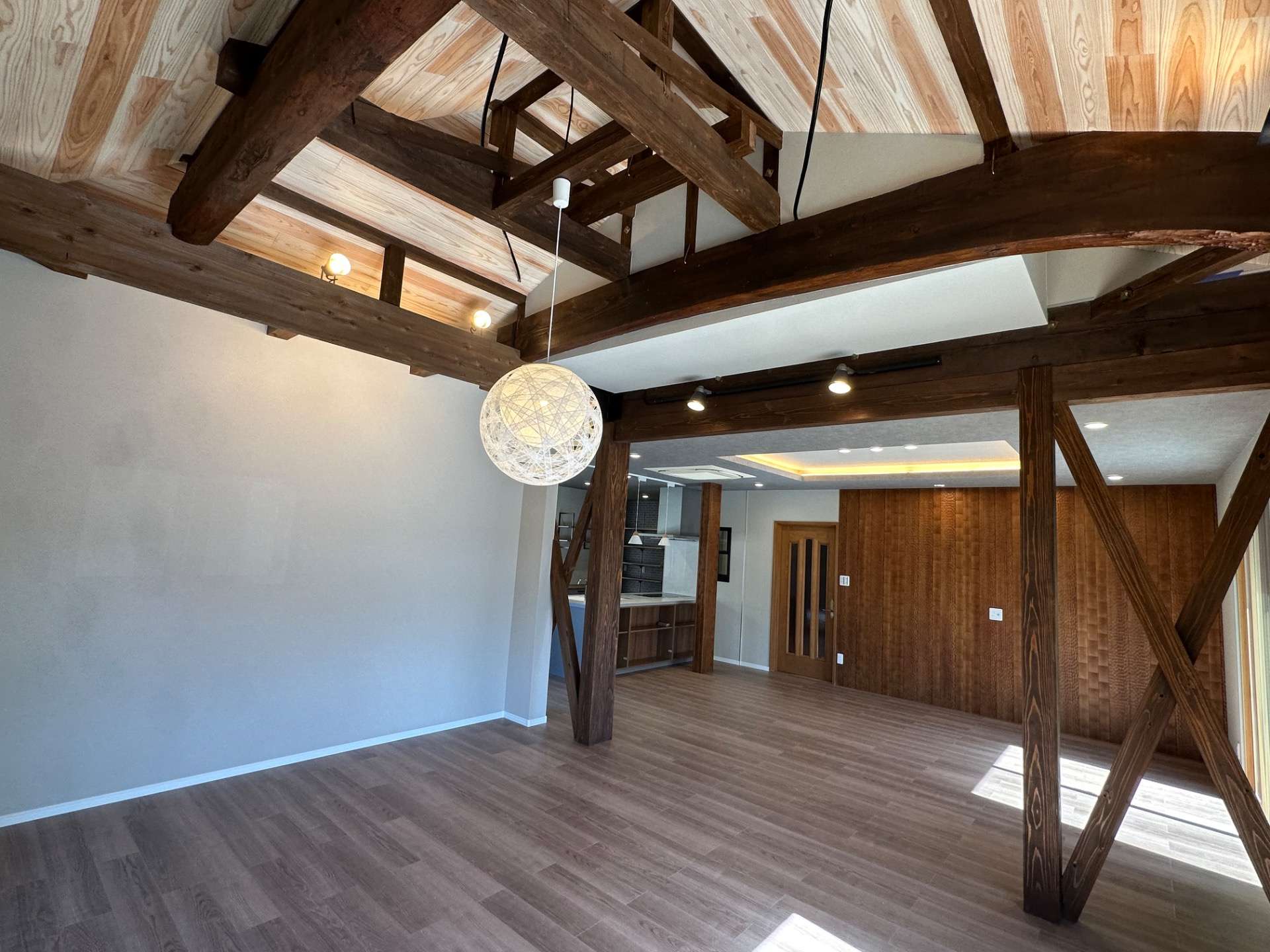 木の梁は、空間に自然な温もりと落ち着きをもたらし、